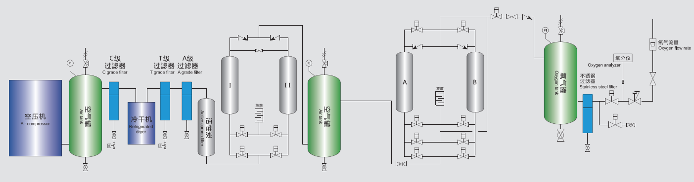 Hava, hava kompresörü tarafından sıkıştırıldıktan sonra, toz giderme, yağ giderme ve kurutmadan sonra, hava depolama tankına girer, hava emme valfi ve sol emme valfi yoluyla sol adsorpsiyon kulesine girer, kule basıncı yükselir, sıkıştırılmış havadaki nitrojen molekülleri, zeolit moleküler elek tarafından adsorbe edilir ve adsorbe edilmemiş oksijen, adsorpsiyon yatağından geçer ve girer. Sol gaz üretim valfi ve oksijen gazı üretim valfi aracılığıyla oksijen depolama tankı. Bu işleme sol emme denir. Süre yaklaşık altmış saniyedir. Sol emme işleminin bitiminden sonra sol adsorpsiyon kulesi ve sağ adsorpsiyon kulesi basınç dengeleme valfi vasıtasıyla bağlanır, böylece iki kulenin basıncı dengelenir, bu işleme basınç dengeleme denir ve süresi 3 ila 5 saniyedir. Basınç eşitlemesinin bitiminden sonra basınçlı hava, hava emme valfi ve sağ emme valfi yoluyla oksijen tankına girer. Bu işleme doğru emme denir ve süresi yaklaşık altmış saniyedir. Aynı zamanda, sol adsorpsiyon kulesindeki zeolit moleküler elek tarafından adsorbe edilen oksijen, sol egzoz valfinin basıncının düşürülmesi yoluyla atmosfere geri salınır. Aksine, sol sütun adsorbe edildiğinde sağ sütun da desorbe olur. Moleküler elekteki dekompresyondan salınan nitrojenin atmosfere tamamen boşaltılması için, oksijen normalde açık olan bir ters üfleme valfından desorpsiyon adsorpsiyon kulesine doğru süpürülür ve ters kuledeki oksijen adsorpsiyon kulesinden dışarı üflenir. Bu sürece geri tepme denir ve desorpsiyonla el ele gider. Sağ emme işlemi bittikten sonra basınç dengeleme işlemine girin ve ardından sol emme işlemine geçerek döngüye devam edin.