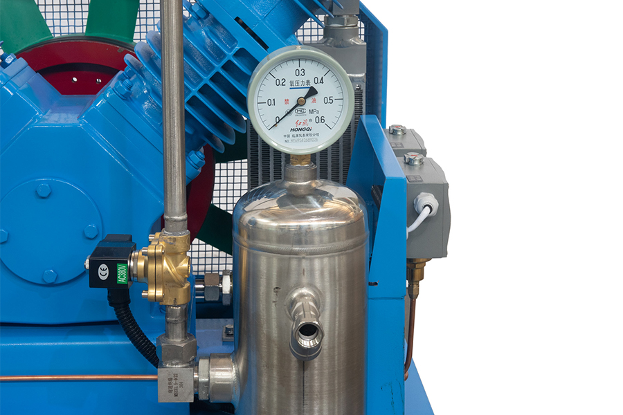 Oksijen, kolayca yanmaya ve patlamaya neden olabilecek şiddetli bir hızlandırıcıdır. Oksijen kompresörlerini tasarlarken ve kullanırken özel dikkat gösterilmelidir: sıkıştırılmış gaz bileşenlerinin yağla teması kesinlikle yasaktır, bakım sırasında yağ kirlenmez ve montajdan önce solventlerle temizlenmelidir.
